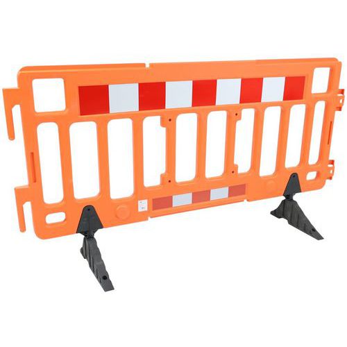 Barrera de seguridad de plástico fácil de transportar. Adecuada para todo tipo de usos urbanos. Cuenta con bandas reflectantes en un lado para una mejor visibilidad. Conexión rápida y sencilla gracias a sus enganches. El material de polietileno hace que la barrera sea resistente a todas las condiciones climáticas. La barrera no se oxida y se instala sin ruido. Patas de goma muy estables.