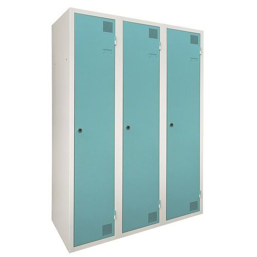 Taquilla de secado con aire caliente por impulsos, muy robusta, con casillero y doble perchero. Perchero de doble compartimento: almacenamiento separado ropa limpia/sucia. Cuerpo y puerta de chapa electrogalvanizado, con refuerzo en omega en la altura. Cómoda de utilizar con un sistema de bisagras que facilita una apertura de 180°. Higiénica con una doble ventilación en parte alta y baja del frontal de la taquilla. Bonito acabado en pintura epoxi lacada, disponible en una amplia paleta de colores atractivos. 2 cierres a elección: cerradura con llave o anclaje para candados. Taquilla con portaetiquetas. Producto fabricado en Francia.