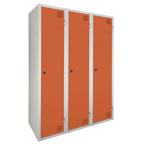 Taquilla de secado con aire caliente por impulsos, muy robusta, con casillero y doble perchero. Perchero de doble compartimento: almacenamiento separado ropa limpia/sucia. Cuerpo y puerta de chapa electrogalvanizado, con refuerzo en omega en la altura. Cómoda de utilizar con un sistema de bisagras que facilita una apertura de 180°. Higiénica con una doble ventilación en parte alta y baja del frontal de la taquilla. Bonito acabado en pintura epoxi lacada, disponible en una amplia paleta de colores atractivos. 2 cierres a elección: cerradura con llave o anclaje para candados. Taquilla con portaetiquetas. Producto fabricado en Francia.