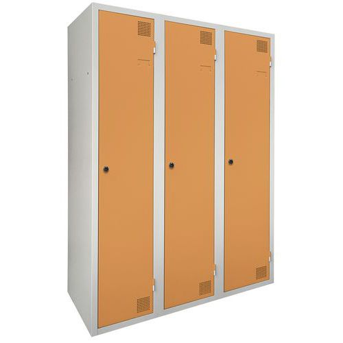 Taquilla de secado con aire caliente por impulsos, muy robusta, con casillero y doble perchero. Perchero de doble compartimento: almacenamiento separado ropa limpia/sucia. Cuerpo y puerta de chapa electrogalvanizado, con refuerzo en omega en la altura. Cómoda de utilizar con un sistema de bisagras que facilita una apertura de 180°. Higiénica con una doble ventilación en parte alta y baja del frontal de la taquilla. Bonito acabado en pintura epoxi lacada, disponible en una amplia paleta de colores atractivos. 2 cierres a elección: cerradura con llave o anclaje para candados. Taquilla con portaetiquetas. Producto fabricado en Francia.