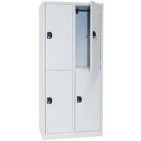 Taquilla con varios compartimentos con perchero con bonito acabado de epoxi.  Ángulos en la esquina redondeada para una seguridad máxima.  Vestuario con revestimiento ultrarresistente a los arañazos.  Cierre silencioso con topes de plástico.   Rejilla de aireación en la parte posterior de cada taquilla.   Asa de cierre con portaetiquetas.