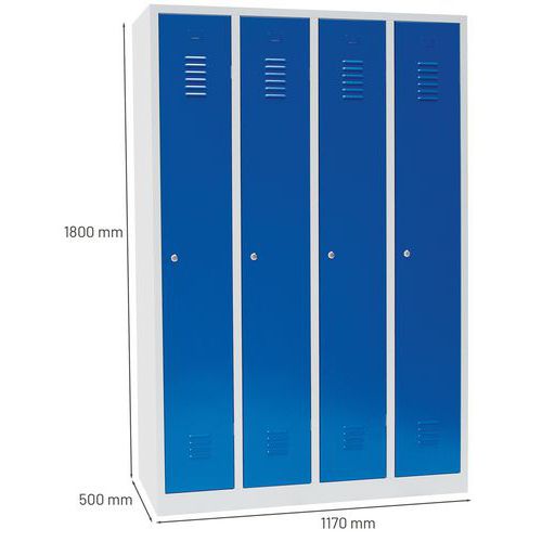 Vestuario robusto, con puertas reforzadas. Apertura óptima a 180° y bisagras invisibles. Higiénico con ventilación en la parte superior e inferior de las puertas. Perforaciones para anclaje a la pared. Portaetiquetas embutido. Garantía al cliente : 10 años Chapa espesor : 7/10a