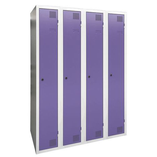 Taquilla de secado con aire caliente por impulsos, de gran robustez, con casillero y perchero. Cuerpo y puerta de chapa electrogalvanizado, con refuerzo en omega en la altura. Cómoda de utilizar con un sistema de bisagras que facilita una apertura de 180°. Higiénica con una doble ventilación en parte alta y baja del frontal de la taquilla. Bonito acabado en pintura epoxi lacada, disponible en una amplia paleta de colores atractivos. 2 cierres a elección: cerradura con llave o anclaje para candados. Taquilla con portaetiquetas. Producto fabricado en Francia.