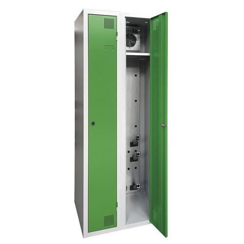 Taquilla de secado con aire caliente por impulsos, de gran robustez, con casillero y perchero. Cuerpo y puerta de chapa electrogalvanizado, con refuerzo en omega en la altura. Cómoda de utilizar con un sistema de bisagras que facilita una apertura de 180°. Higiénica con una doble ventilación en parte alta y baja del frontal de la taquilla. Bonito acabado en pintura epoxi lacada, disponible en una amplia paleta de colores atractivos. 2 cierres a elección: cerradura con llave o anclaje para candados. Taquilla con portaetiquetas. Producto fabricado en Francia.