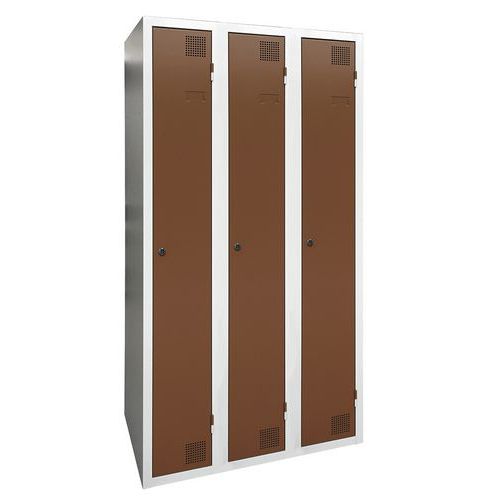 Taquilla de secado con aire caliente por impulsos, de gran robustez, con casillero y perchero. Cuerpo y puerta de chapa electrogalvanizado, con refuerzo en omega en la altura. Cómoda de utilizar con un sistema de bisagras que facilita una apertura de 180°. Higiénica con una doble ventilación en parte alta y baja del frontal de la taquilla. Bonito acabado en pintura epoxi lacada, disponible en una amplia paleta de colores atractivos. 2 cierres a elección: cerradura con llave o anclaje para candados. Taquilla con portaetiquetas. Producto fabricado en Francia.