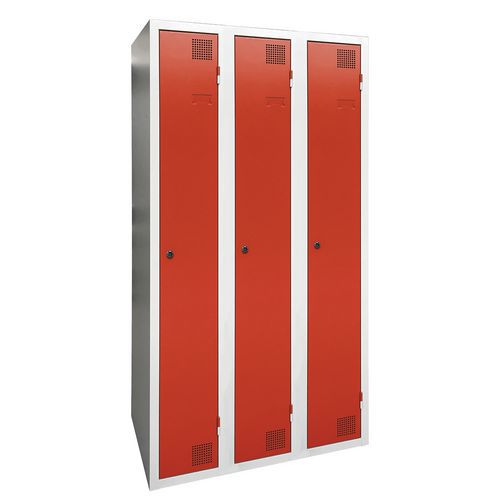 Taquilla de secado con aire caliente por impulsos, de gran robustez, con casillero y perchero. Cuerpo y puerta de chapa electrogalvanizado, con refuerzo en omega en la altura. Cómoda de utilizar con un sistema de bisagras que facilita una apertura de 180°. Higiénica con una doble ventilación en parte alta y baja del frontal de la taquilla. Bonito acabado en pintura epoxi lacada, disponible en una amplia paleta de colores atractivos. 2 cierres a elección: cerradura con llave o anclaje para candados. Taquilla con portaetiquetas. Producto fabricado en Francia.