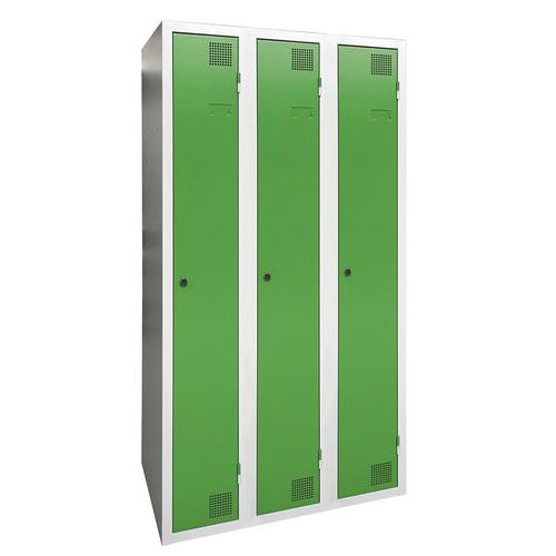 Taquilla de secado con aire caliente por impulsos, de gran robustez, con casillero y perchero. Cuerpo y puerta de chapa electrogalvanizado, con refuerzo en omega en la altura. Cómoda de utilizar con un sistema de bisagras que facilita una apertura de 180°. Higiénica con una doble ventilación en parte alta y baja del frontal de la taquilla. Bonito acabado en pintura epoxi lacada, disponible en una amplia paleta de colores atractivos. 2 cierres a elección: cerradura con llave o anclaje para candados. Taquilla con portaetiquetas. Producto fabricado en Francia.