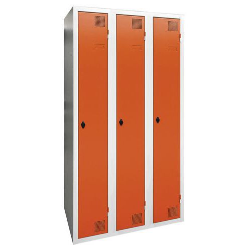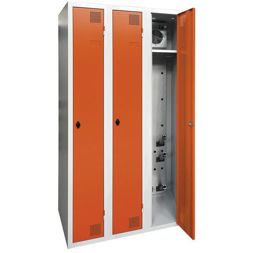 Taquilla de secado con aire caliente por impulsos, de gran robustez, con casillero y perchero. Cuerpo y puerta de chapa electrogalvanizado, con refuerzo en omega en la altura. Cómoda de utilizar con un sistema de bisagras que facilita una apertura de 180°. Higiénica con una doble ventilación en parte alta y baja del frontal de la taquilla. Bonito acabado en pintura epoxi lacada, disponible en una amplia paleta de colores atractivos. 2 cierres a elección: cerradura con llave o anclaje para candados. Taquilla con portaetiquetas. Producto fabricado en Francia.