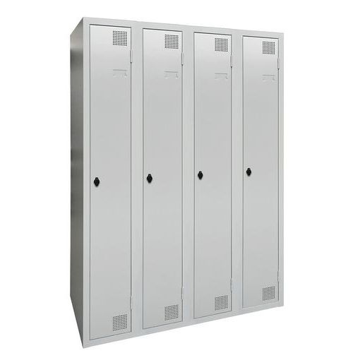Taquilla de secado con aire caliente por impulsos, de gran robustez, con casillero y perchero. Cuerpo y puerta de chapa electrogalvanizado, con refuerzo en omega en la altura. Cómoda de utilizar con un sistema de bisagras que facilita una apertura de 180°. Higiénica con una doble ventilación en parte alta y baja del frontal de la taquilla. Bonito acabado en pintura epoxi lacada, disponible en una amplia paleta de colores atractivos. 2 cierres a elección: cerradura con llave o anclaje para candados. Taquilla con portaetiquetas. Producto fabricado en Francia.