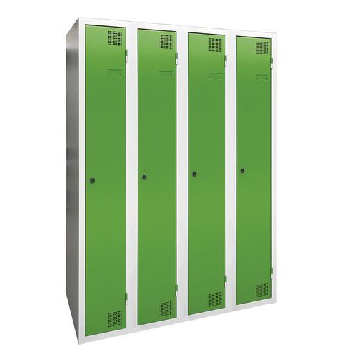 Taquilla de secado con aire caliente por impulsos, de gran robustez, con casillero y perchero. Cuerpo y puerta de chapa electrogalvanizado, con refuerzo en omega en la altura. Cómoda de utilizar con un sistema de bisagras que facilita una apertura de 180°. Higiénica con una doble ventilación en parte alta y baja del frontal de la taquilla. Bonito acabado en pintura epoxi lacada, disponible en una amplia paleta de colores atractivos. 2 cierres a elección: cerradura con llave o anclaje para candados. Taquilla con portaetiquetas. Producto fabricado en Francia.