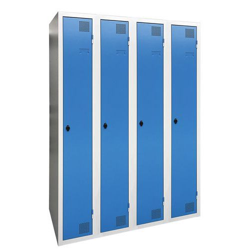 Taquilla de secado con aire caliente por impulsos, de gran robustez, con casillero y perchero. Cuerpo y puerta de chapa electrogalvanizado, con refuerzo en omega en la altura. Cómoda de utilizar con un sistema de bisagras que facilita una apertura de 180°. Higiénica con una doble ventilación en parte alta y baja del frontal de la taquilla. Bonito acabado en pintura epoxi lacada, disponible en una amplia paleta de colores atractivos. 2 cierres a elección: cerradura con llave o anclaje para candados. Taquilla con portaetiquetas. Producto fabricado en Francia.