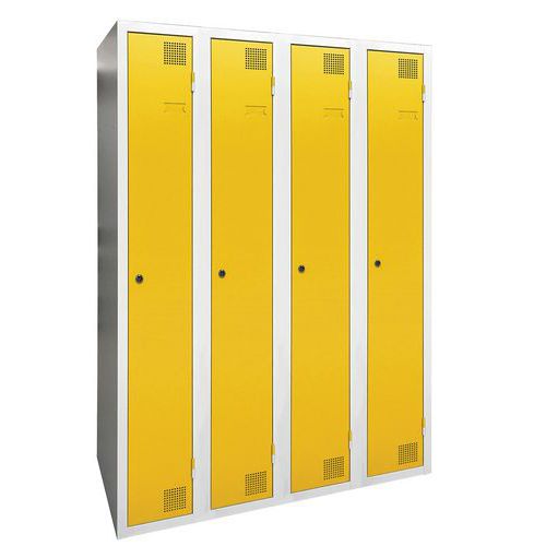 Taquilla de secado con aire caliente por impulsos, de gran robustez, con casillero y perchero. Cuerpo y puerta de chapa electrogalvanizado, con refuerzo en omega en la altura. Cómoda de utilizar con un sistema de bisagras que facilita una apertura de 180°. Higiénica con una doble ventilación en parte alta y baja del frontal de la taquilla. Bonito acabado en pintura epoxi lacada, disponible en una amplia paleta de colores atractivos. 2 cierres a elección: cerradura con llave o anclaje para candados. Taquilla con portaetiquetas. Producto fabricado en Francia.