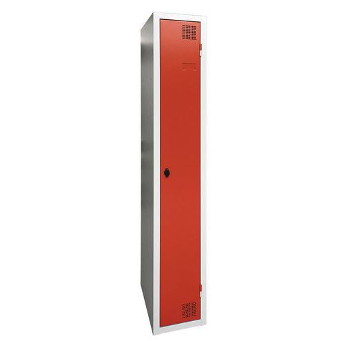 Taquilla de secado con aire caliente por impulsos, de gran robustez, con casillero y perchero. Cuerpo y puerta de chapa electrogalvanizado, con refuerzo en omega en la altura. Cómoda de utilizar con un sistema de bisagras que facilita una apertura de 180°. Higiénica con una doble ventilación en parte alta y baja del frontal de la taquilla. Bonito acabado en pintura epoxi lacada, disponible en una amplia paleta de colores atractivos. 2 cierres a elección: cerradura con llave o anclaje para candados. Taquilla con portaetiquetas. Producto fabricado en Francia.