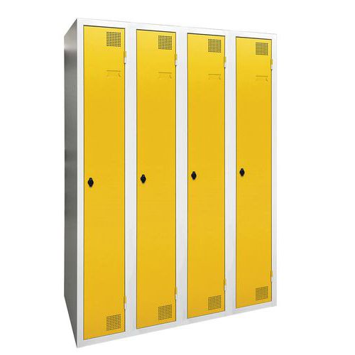 Taquilla de secado con aire caliente por impulsos, de gran robustez, con casillero y perchero. Cuerpo y puerta de chapa electrogalvanizado, con refuerzo en omega en la altura. Cómoda de utilizar con un sistema de bisagras que facilita una apertura de 180°. Higiénica con una doble ventilación en parte alta y baja del frontal de la taquilla. Bonito acabado en pintura epoxi lacada, disponible en una amplia paleta de colores atractivos. 2 cierres a elección: cerradura con llave o anclaje para candados. Taquilla con portaetiquetas. Producto fabricado en Francia.