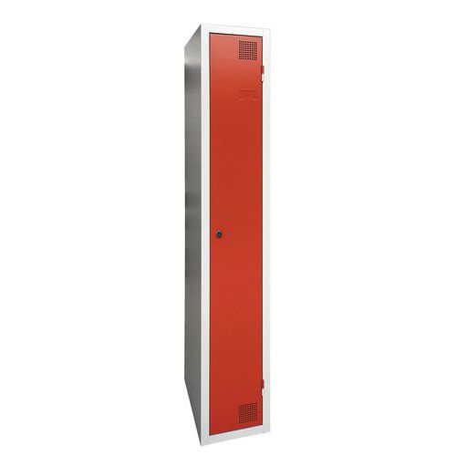 Taquilla de secado con aire caliente por impulsos, de gran robustez, con casillero y perchero. Cuerpo y puerta de chapa electrogalvanizado, con refuerzo en omega en la altura. Cómoda de utilizar con un sistema de bisagras que facilita una apertura de 180°. Higiénica con una doble ventilación en parte alta y baja del frontal de la taquilla. Bonito acabado en pintura epoxi lacada, disponible en una amplia paleta de colores atractivos. 2 cierres a elección: cerradura con llave o anclaje para candados. Taquilla con portaetiquetas. Producto fabricado en Francia.