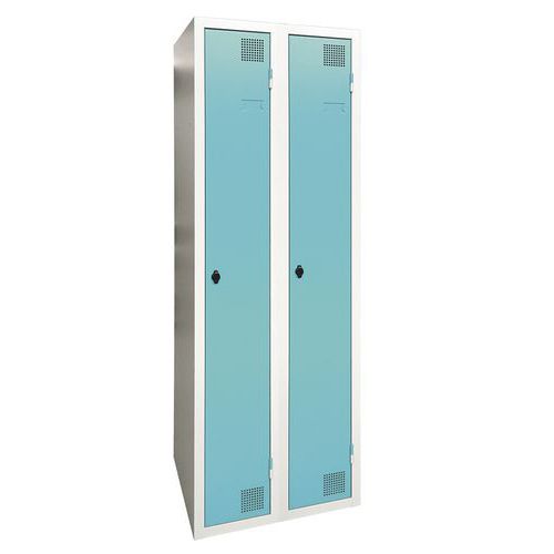 Taquilla de secado con aire caliente por impulsos, de gran robustez, con casillero y perchero. Cuerpo y puerta de chapa electrogalvanizado, con refuerzo en omega en la altura. Cómoda de utilizar con un sistema de bisagras que facilita una apertura de 180°. Higiénica con una doble ventilación en parte alta y baja del frontal de la taquilla. Bonito acabado en pintura epoxi lacada, disponible en una amplia paleta de colores atractivos. 2 cierres a elección: cerradura con llave o anclaje para candados. Taquilla con portaetiquetas. Producto fabricado en Francia.