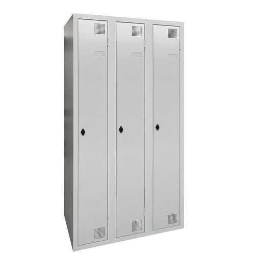 Taquilla de secado con aire caliente por impulsos, de gran robustez, con casillero y perchero. Cuerpo y puerta de chapa electrogalvanizado, con refuerzo en omega en la altura. Cómoda de utilizar con un sistema de bisagras que facilita una apertura de 180°. Higiénica con una doble ventilación en parte alta y baja del frontal de la taquilla. Bonito acabado en pintura epoxi lacada, disponible en una amplia paleta de colores atractivos. 2 cierres a elección: cerradura con llave o anclaje para candados. Taquilla con portaetiquetas. Producto fabricado en Francia.