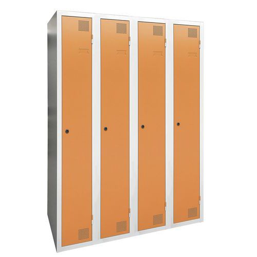 Taquilla de secado con aire caliente por impulsos, de gran robustez, con casillero y perchero. Cuerpo y puerta de chapa electrogalvanizado, con refuerzo en omega en la altura. Cómoda de utilizar con un sistema de bisagras que facilita una apertura de 180°. Higiénica con una doble ventilación en parte alta y baja del frontal de la taquilla. Bonito acabado en pintura epoxi lacada, disponible en una amplia paleta de colores atractivos. 2 cierres a elección: cerradura con llave o anclaje para candados. Taquilla con portaetiquetas. Producto fabricado en Francia.