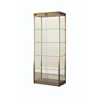 Vitrina de exposición alta con iluminación en el techo. Estructura robusta y resistente. Cristal templado de alta calidad en todas las superficies (incluidas puertas y baldas). Puertas batientes con cerradura de seguridad. La vitrina se suministra desmontada.
