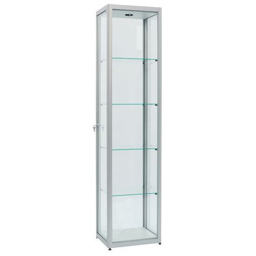 Vitrina de exposición Factory, diseño con bonito acabado en aluminio anodizado. Mueble de diseño extraamplio y muy profundo. Construcción resistente: marco especial con perfil de aluminio. Acristalamiento exterior de calidad con vidrio templado de seguridad. Baldas regulables en altura de vidrio templado de seguridad. Patas- base de altura ajustable para los modelos de suelo. Iluminación LV y balasto electrónico listo para conectarse. Arriba y abajo: panel de partículas de madera (incluso para modelo con puertas) Fabricado en la UE Montaje : Para montar Balda carga maxi (kg) : 10 kg
