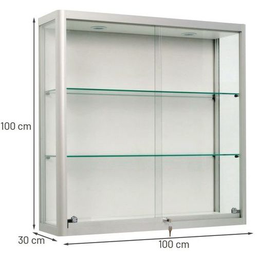 Vitrina de exposición Factory, diseño con bonito acabado en aluminio anodizado. Mueble de diseño extraamplio y muy profundo. Construcción resistente: marco especial con perfil de aluminio. Acristalamiento exterior de calidad con vidrio templado de seguridad. Baldas regulables en altura de vidrio templado de seguridad. Patas- base de altura ajustable para los modelos de suelo. Iluminación LV y balasto electrónico listo para conectarse. Arriba y abajo: panel de partículas de madera (incluso para modelo con puertas)