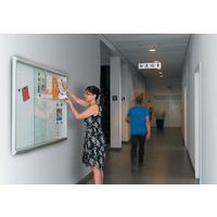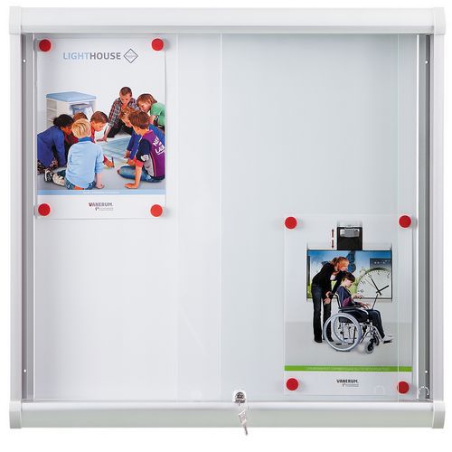 Vitrina de exposición interior Naturas con puertas correderas que nunca sobresalen, lo que evita cualquier posible molestia, golpe o bloqueo. Perfecta para lugares muy transitados donde cada centímetro cuenta. Gran capacidad de exposición (de 6 a 27 hojas A4). Ya sea para una exposición limitada o una comunicación más densa, la vitrina se adapta a todas las necesidades: escuelas, oficinas, vestíbulos, comunidades de propietarios, talleres...